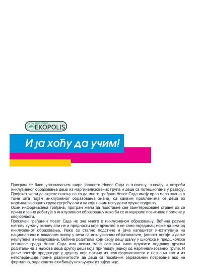 Udruženje „Eko polis“ pokreće novi društveni projekat „I ja hoću da učim“ namenjen podizanju svesti o inkluzivnom obrazovanju dece iz marginalizovanih grupa i dece sa teškoćama u razvoju. Cilj je da se kroz edukaciju i dijalog suzbiju predrasude, demantuju zablude i osnaži zajednica Novog Sada u podršci najugroženijima. Projekat traje od narednog meseca do decembra, a aktivnosti uključuju objavu stručnih tekstova, distribuciju velikog broja informativnih flajera i edukativnih brošura.